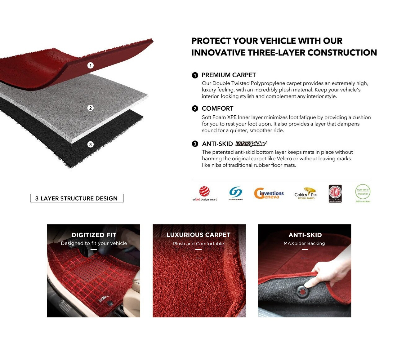 Building on the exceptional features of the acclaimed GLORY range—such as 3D raised edges, water resistance, and anti-slip technology— the PREMIUM Maxpider®️ range takes luxury to new heights. With plush nylon carpets that are twice as thick and available in 10 unique colors, these mats offer unparalleled customization. The PREMIUM Maxpider®️ range redefines luxury car mats, setting a new standard in aesthetics, durability, and opulence.