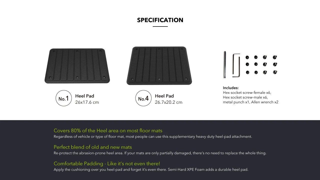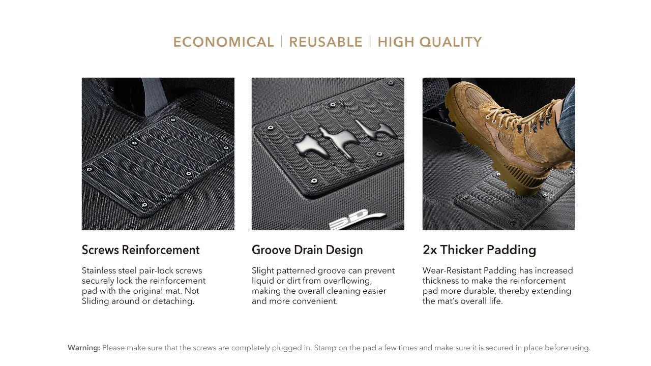 Upgrade your floor liners with our screw-on reinforcement pad for a fresh look. Our lightweight and stylish floor liners are designed to last, but if you notice wear in the heel pad area, it's time to replace them or opt for our 3D Enhanced padding for partial repairs.