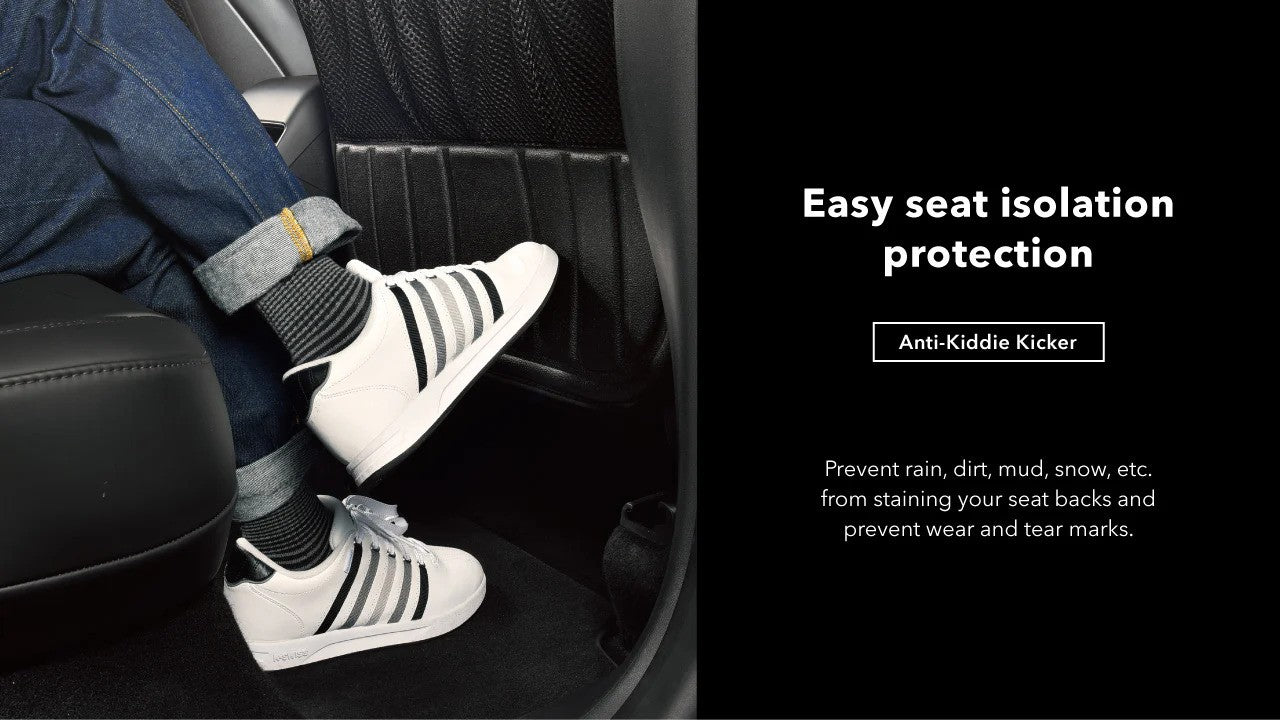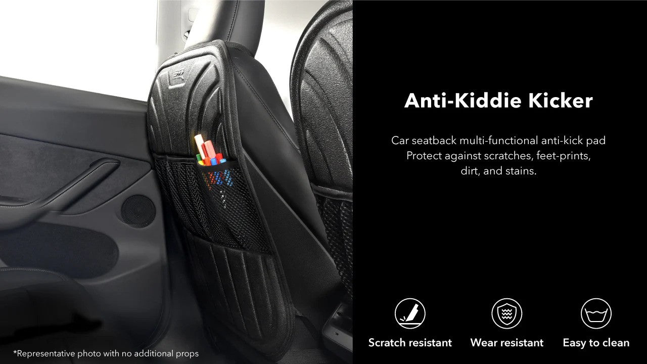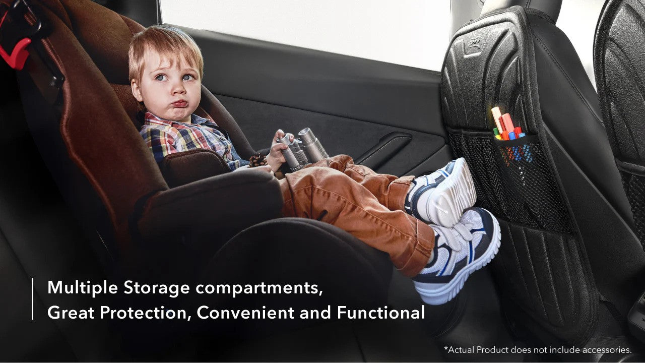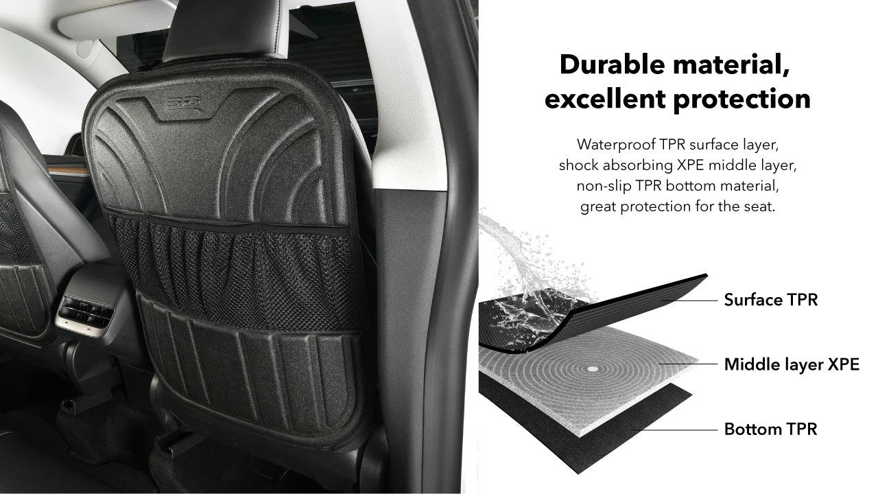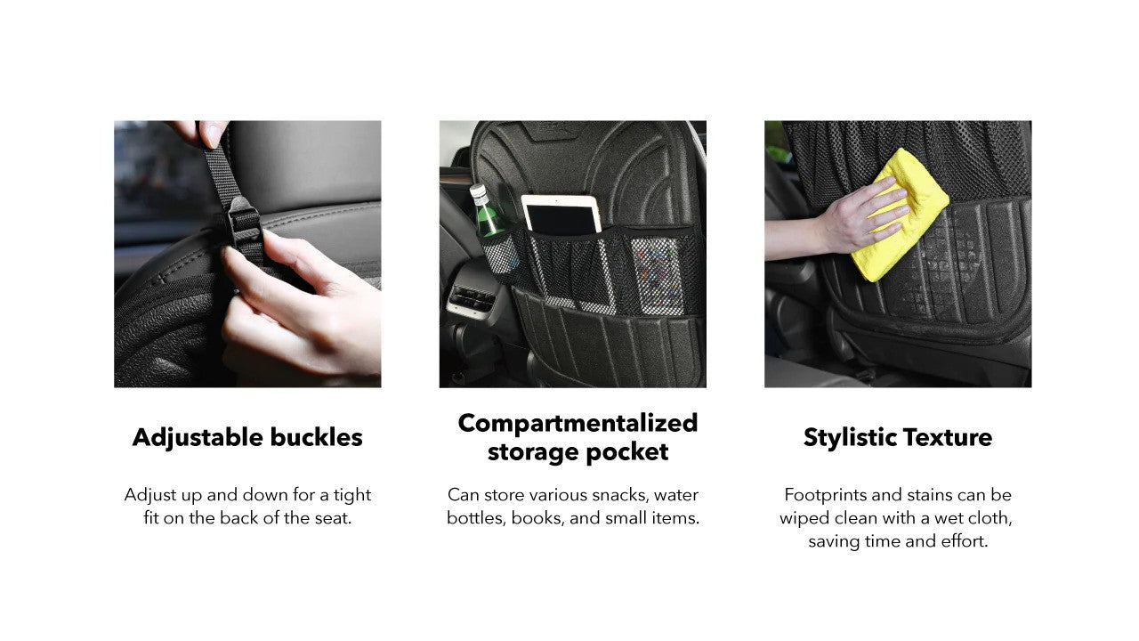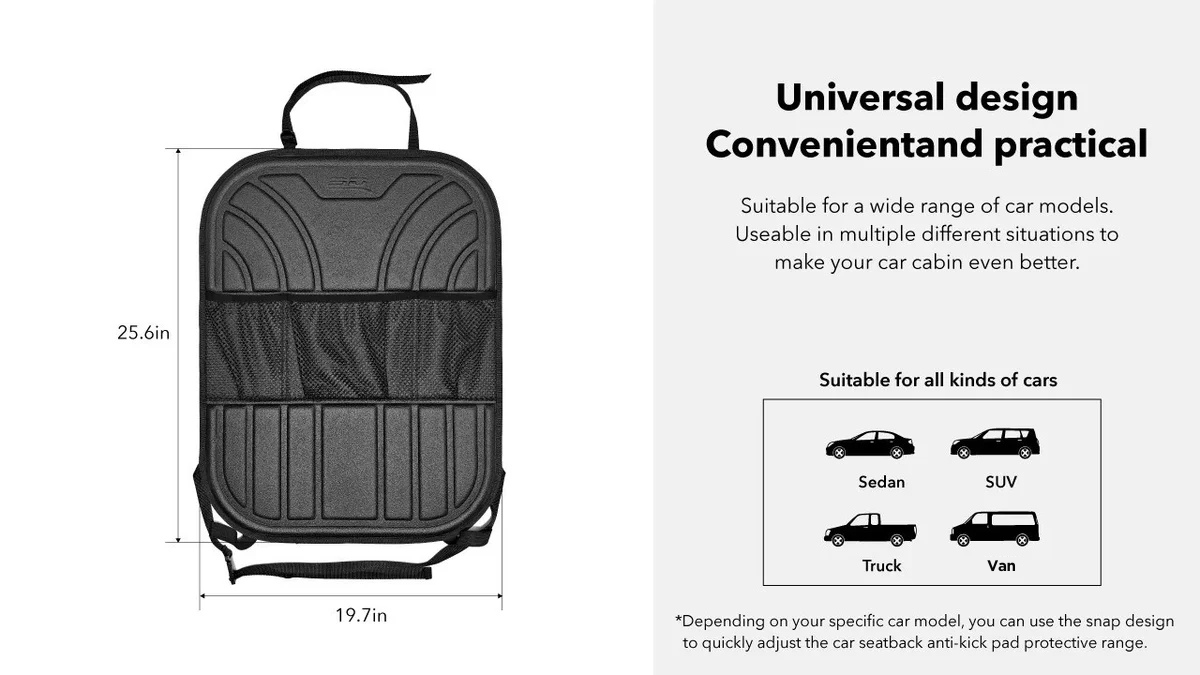 Our Kiddie Kicker seatback protectors are scratch-resistant, wear-resistant, and easy to clean, eliminating worries about kick marks. They shield against rain, dirt, mud, and snow with a waterproof TPR surface layer, shock-absorbing XPE, and an anti-slip bottom layer. The layered storage bag offers convenient space for snacks, water bottles, books, and more. A quick wipe with a wet cloth keeps the protector looking like new. Lightweight, portable, and practical, this car accessory is easy to carry and use.