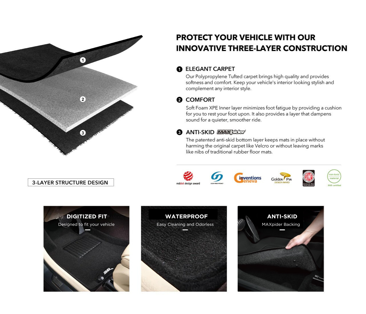 Our superior waterproof nylon carpets, imported from Europe, deliver exceptional quality, comfort, and durability. The 3D custom design, featuring a rigid surface and raised edges, offers maximum coverage to protect your car's original floor. An additional TPR rubber heel pad on the driver’s side mat further enhances durability. Plus, our products are 100% environmentally friendly, non-toxic, and odorless, ensuring a safe and fresh driving experience.