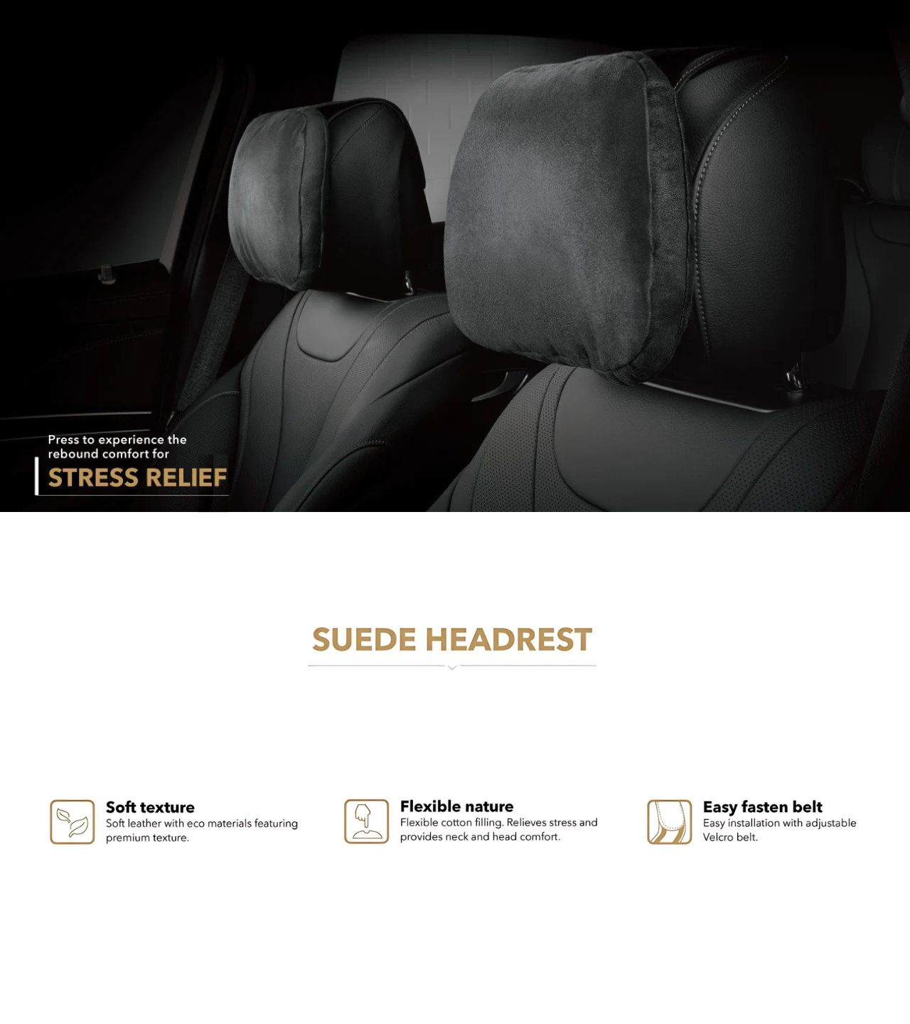 Designed to deliver exceptional head comfort with its flexible nature cotton filling. Crafted from soft, eco-friendly suede materials, it offers a luxurious texture that enhances your driving experience. The headrest is easy to install, featuring an adjustable Velcro belt that ensures a secure fit, making it a perfect blend of comfort, style, and sustainability.