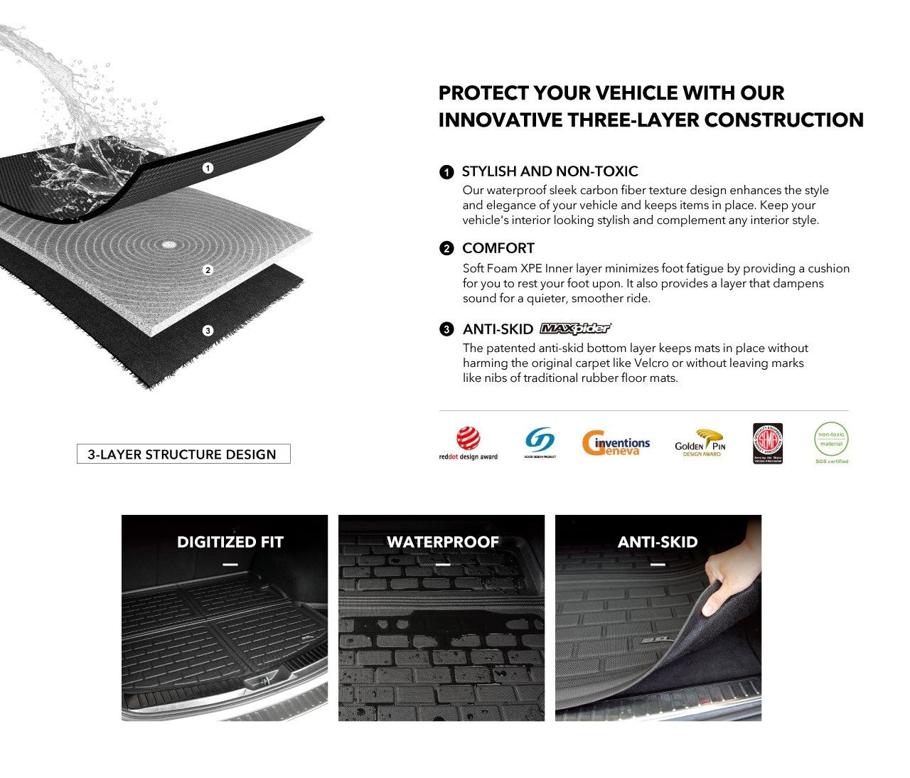 The custom-molded boot liner, featuring a 3-dimensional design, effectively prevents dirt and spills from reaching your car's original carpet. Crafted from eco-friendly materials, it is strong, durable, and lightweight. The patented MAXpider®️ underline ensures the mat stays securely in place, keeping your cargo clean and protected.
